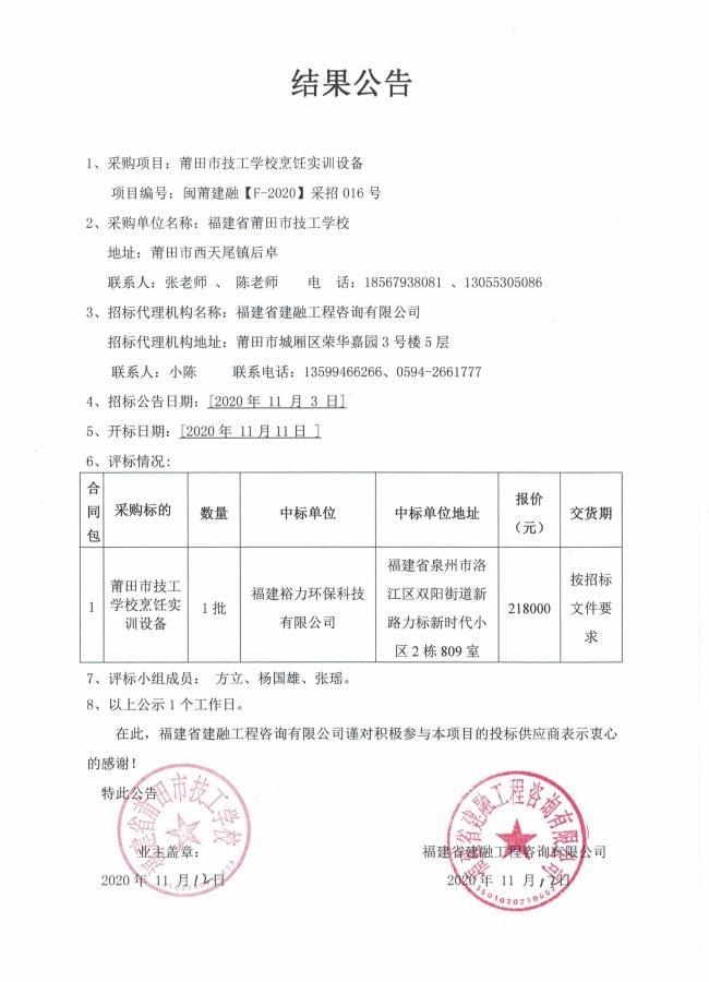 结果公告(项目编号:闽莆建融【F-2020】采招016号)